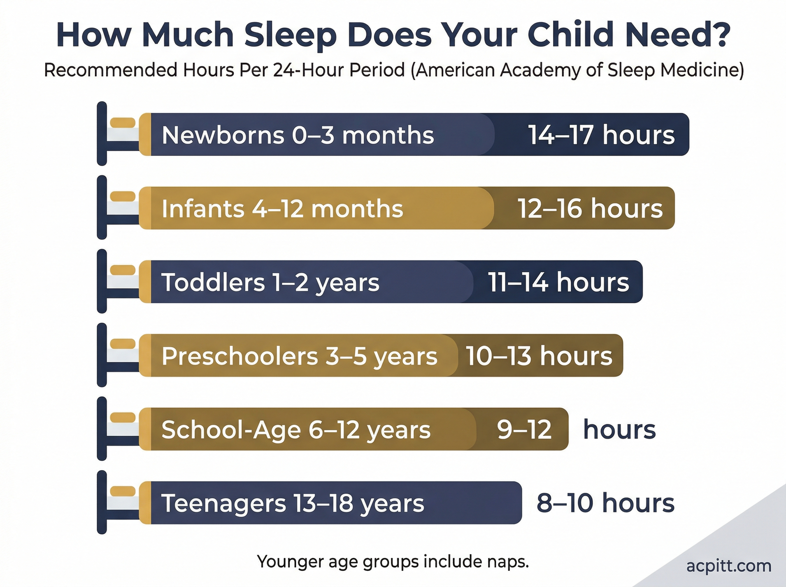 One of the most common mistakes parents make is underestimating how much sleep their child actually requires. The American Academy of Sleep Medicine provides these guidelines for total sleep per 24-hour period: